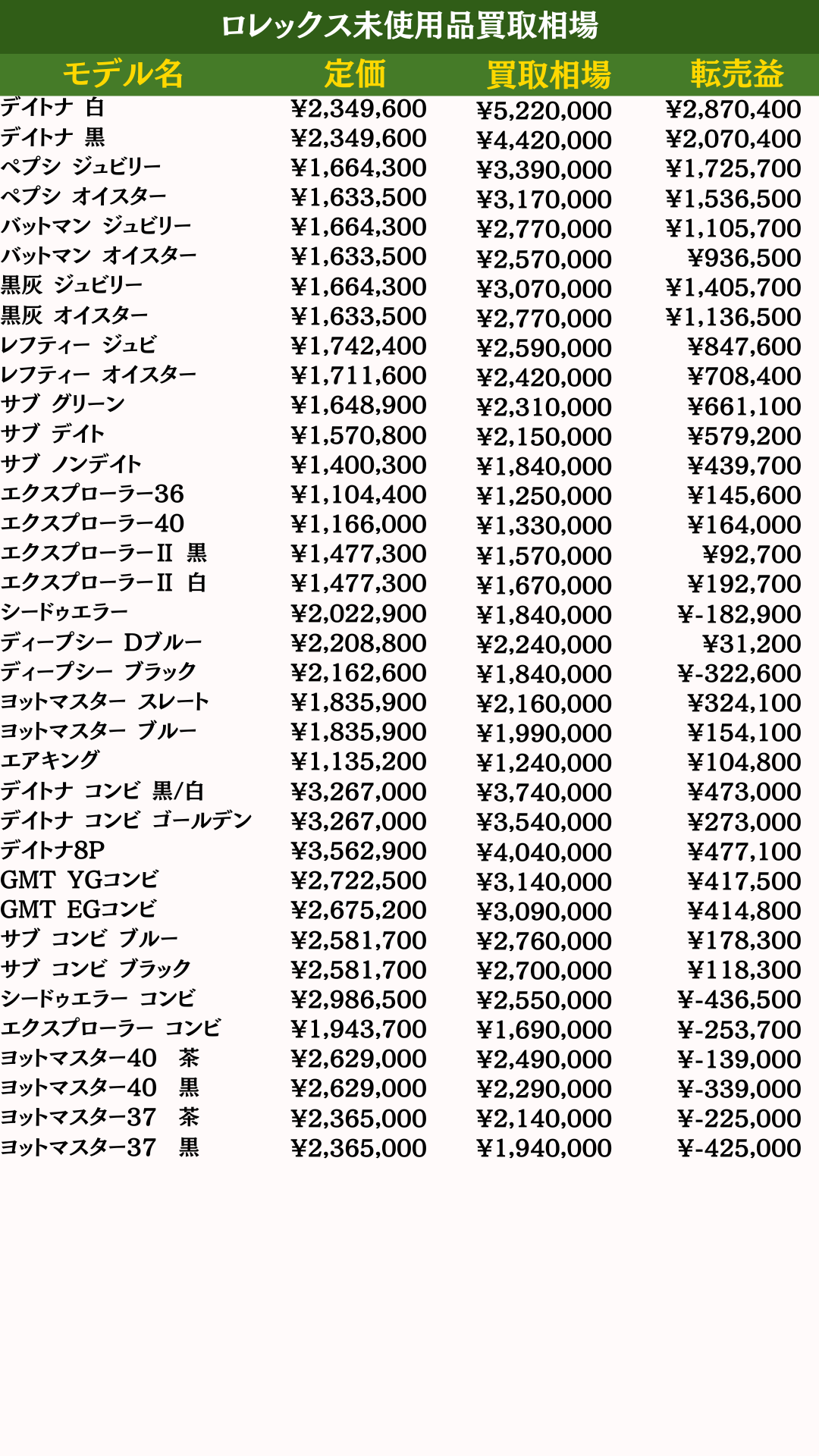ロレックスの相場は、ギャラ日や状態によって大きく変動します。ブログ内ご紹介した相場は「未使用・ギャラ1ヶ月以内」の一例にすぎません。ギャラ日が1年違うだけで数万円変わることもあり、外装の状態や付属品の有無によっても査定額は大きく変わります。また、今回紹介していないモデルの相場が気になる方は、下記の買取業者がおすすめです。査定は完全無料なので相見積もりや腕時計相場把握としてご活用ください。