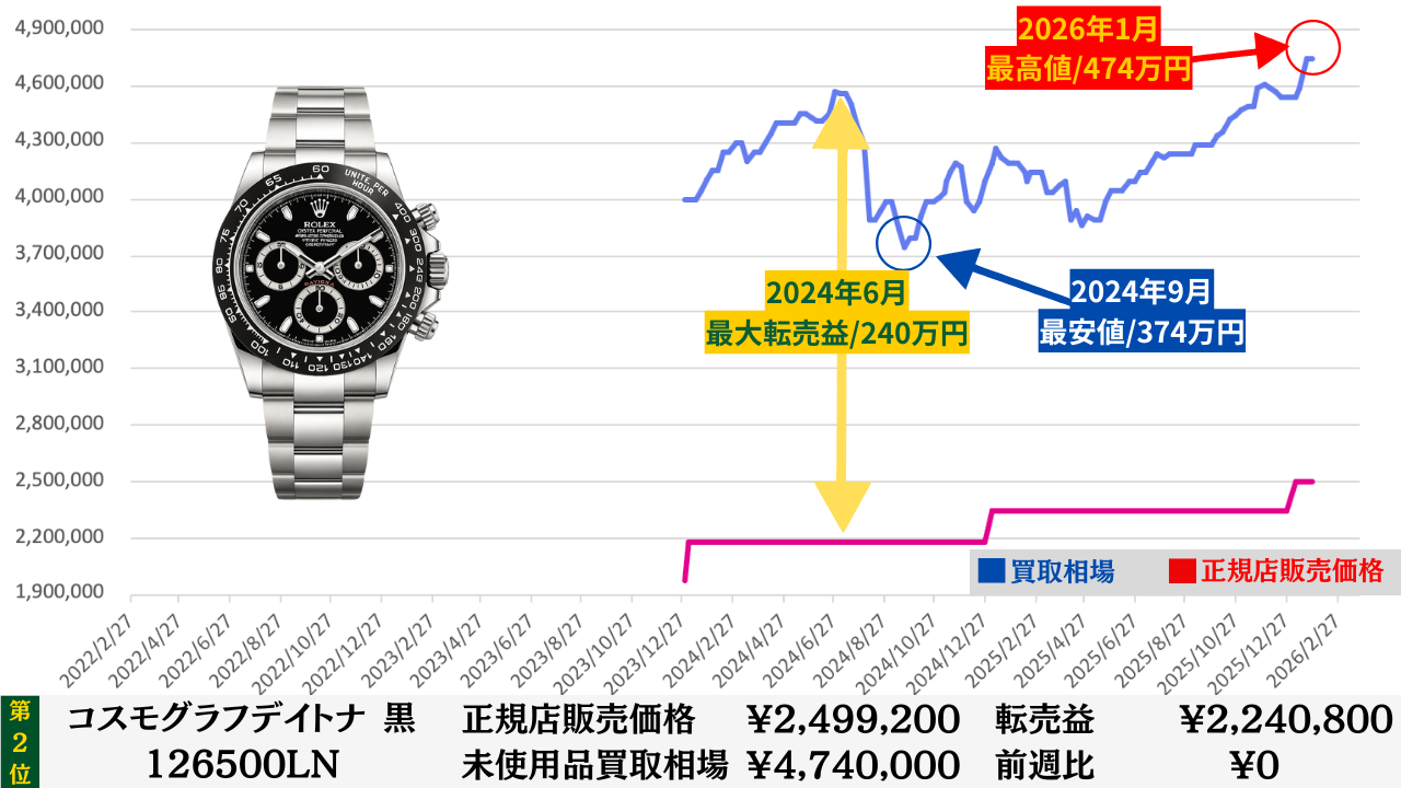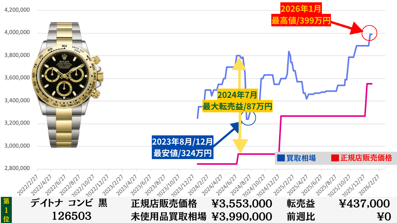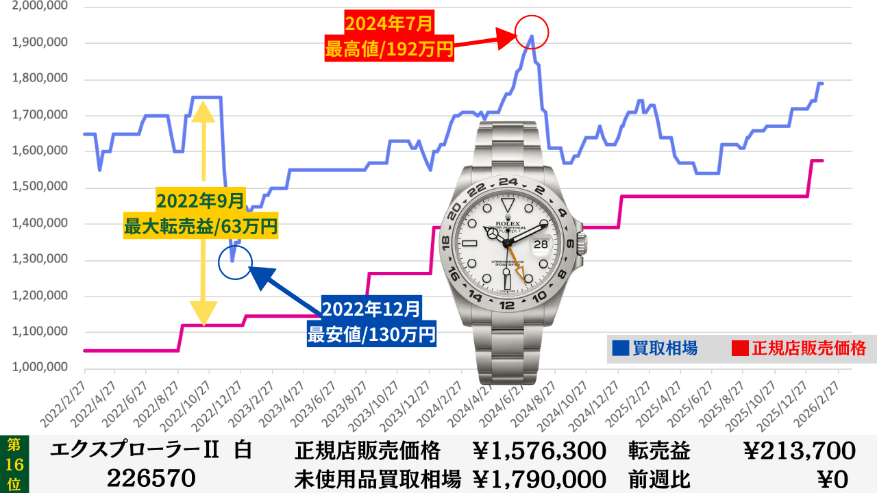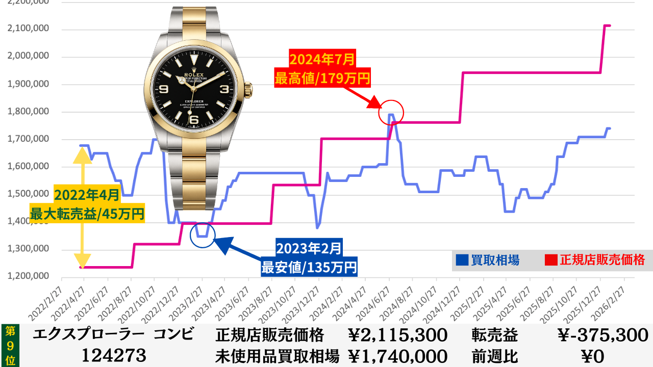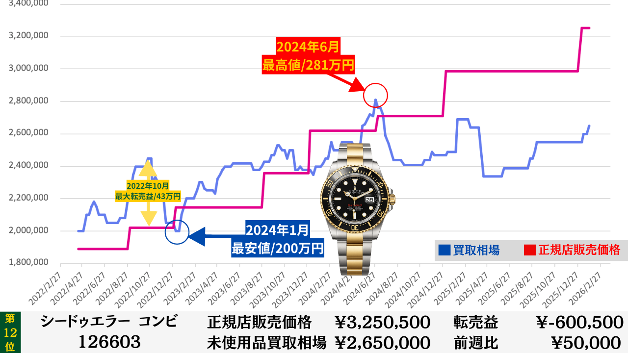 ロレックス買取相場推移グラフ/プロフェッショナルコンビモデル【転売益順】