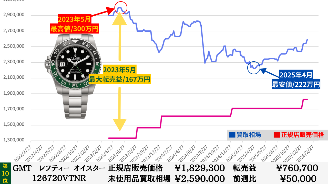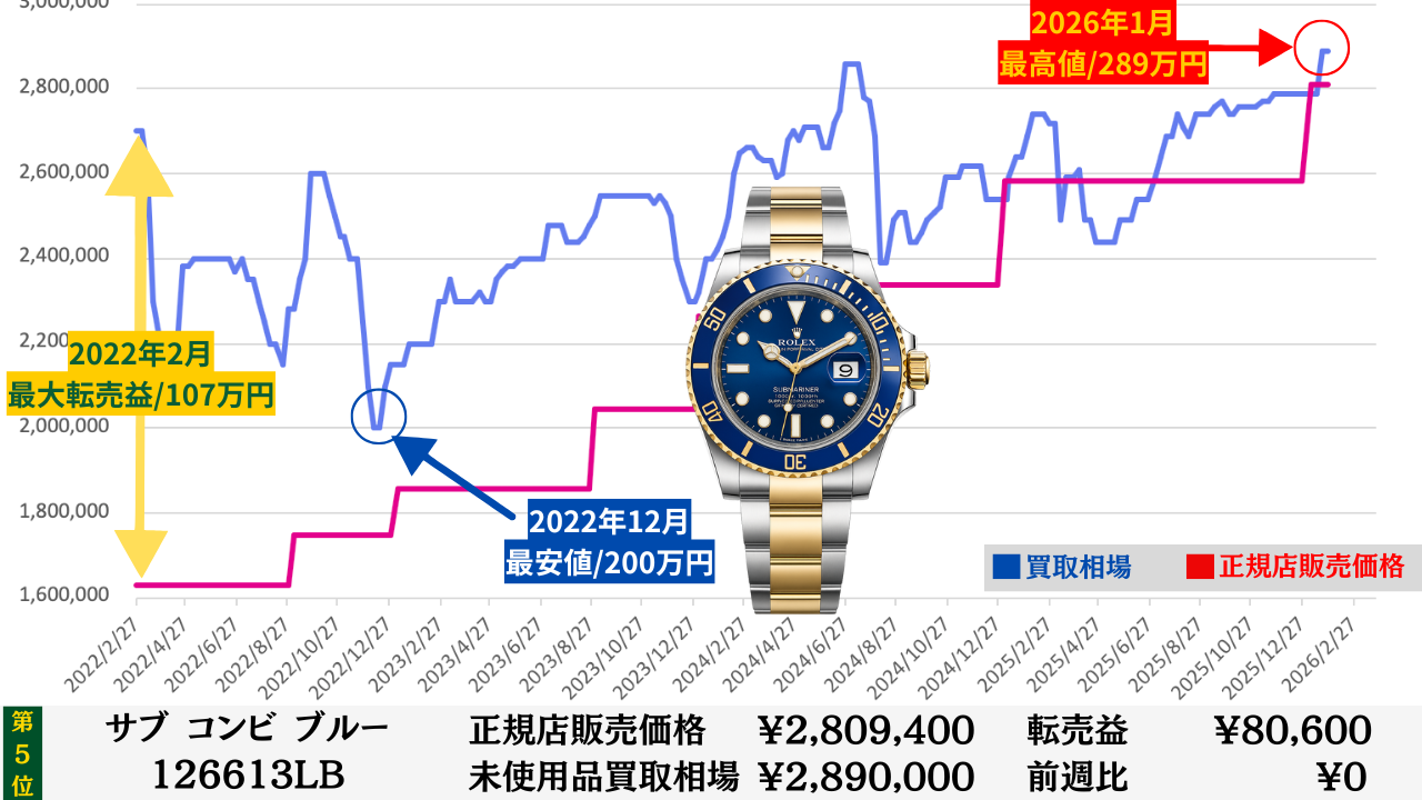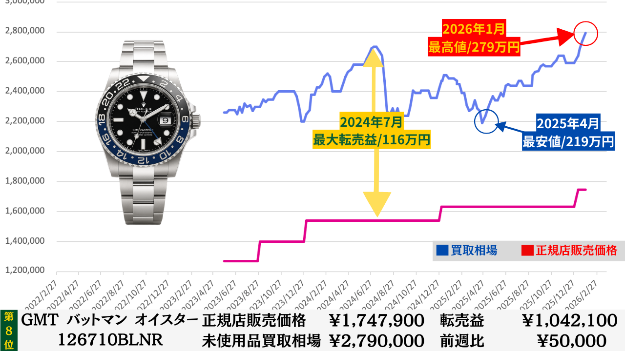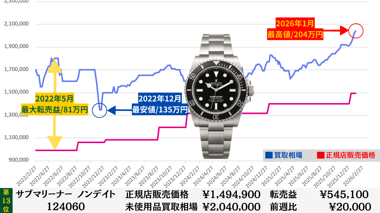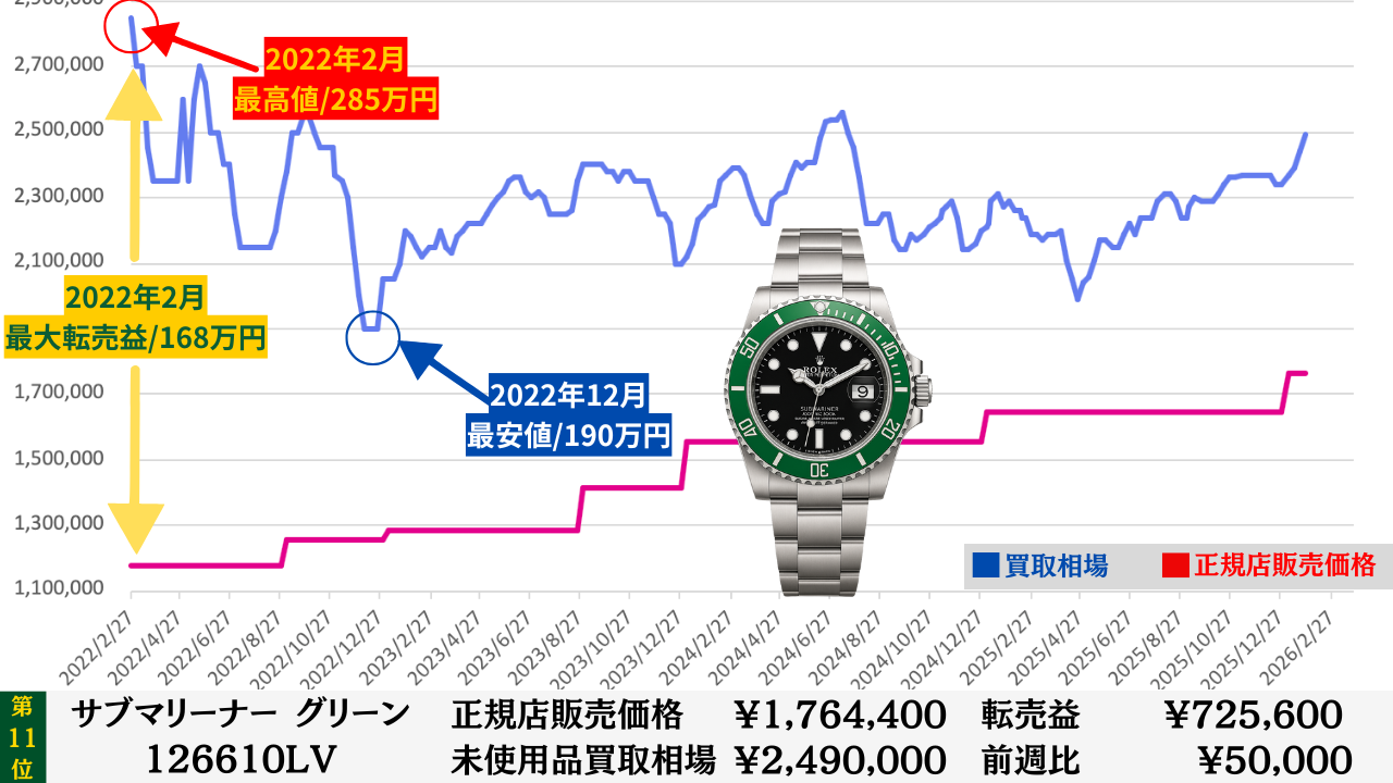 「腕時計を高く売る最大のコツ」は“どこの買取店で売るか”より“どのタイミングで売るか”です。買取店ごとの差は交渉次第で数万円程度に収まることが多いですが、売るタイミングによる相場差は下記買取相場推移グラフでもわかるように、ステンレスモデルであっても数十万円変わります。その為高額売却の最大のコツは買取店の選定より売るタイミングを見極めることです。このページではそのヒントになる買取相場情報を毎週更新していますので、皆さんの売却判断のヒントや相場チェックの参考としてご活用ください。