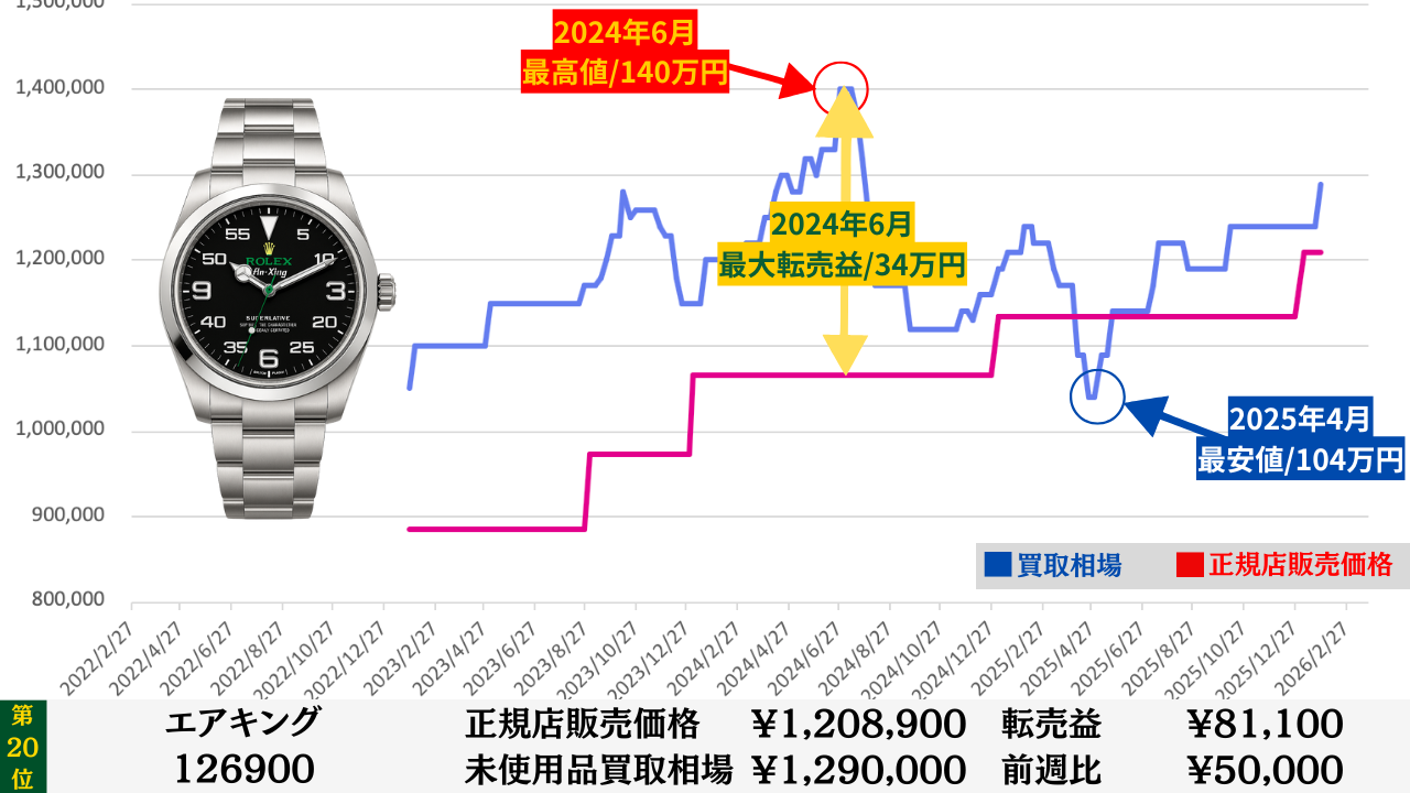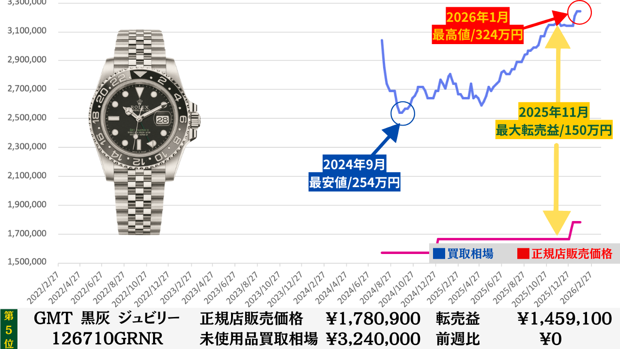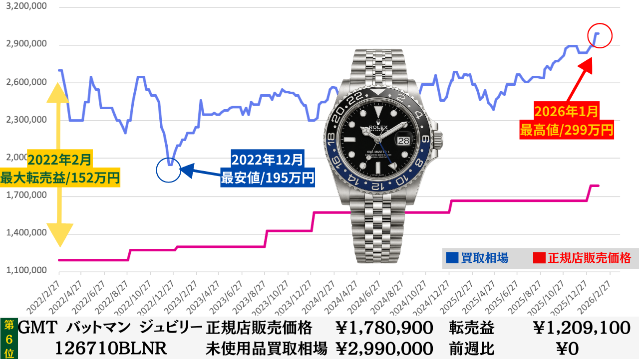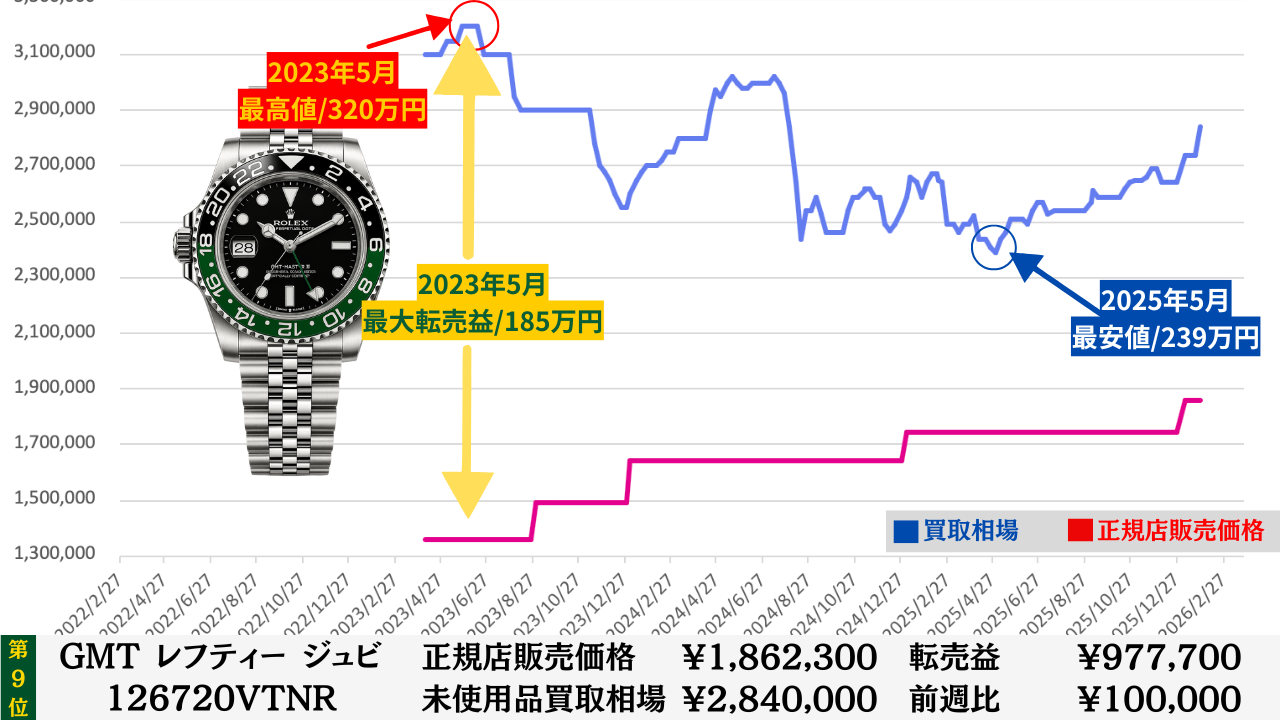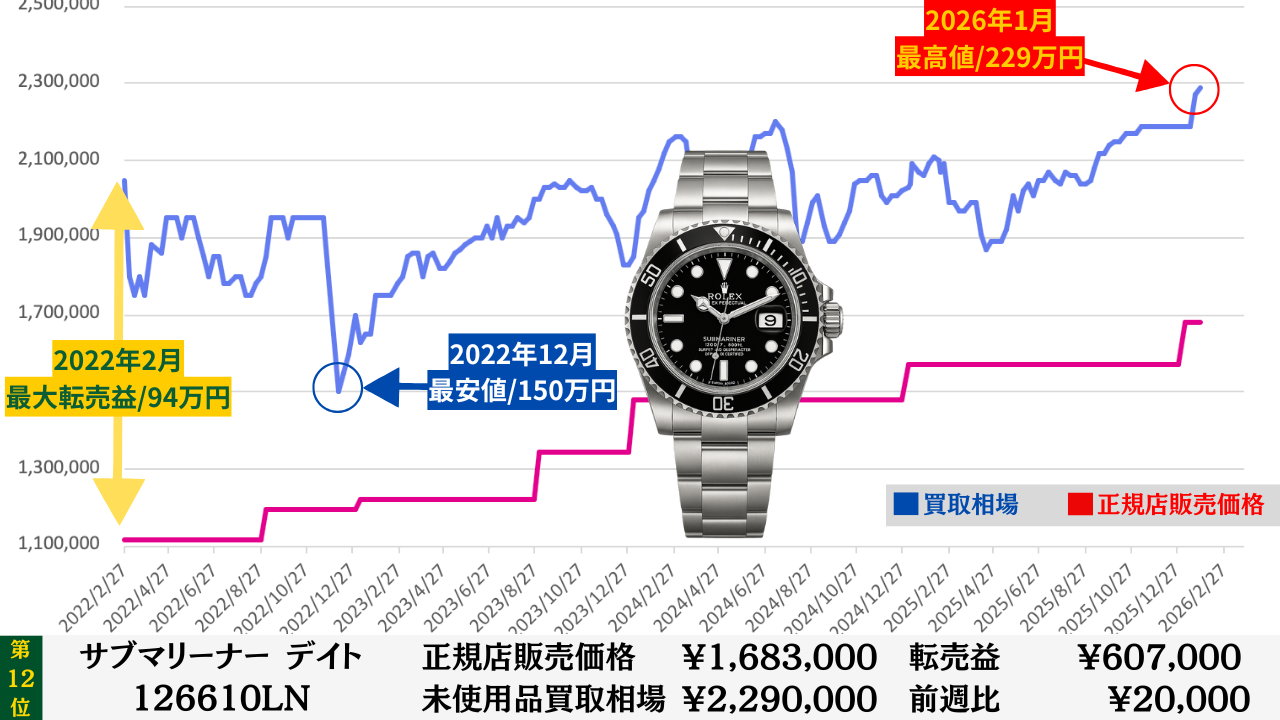 「腕時計を高く売る最大のコツ」は“どこの買取店で売るか”より“どのタイミングで売るか”です。買取店ごとの差は交渉次第で数万円程度に収まることが多いですが、売るタイミングによる相場差は下記買取相場推移グラフでもわかるように、ステンレスモデルであっても数十万円変わります。その為高額売却の最大のコツは買取店の選定より売るタイミングを見極めることです。このページではそのヒントになる買取相場情報を毎週更新していますので、皆さんの売却判断のヒントや相場チェックの参考としてご活用ください。