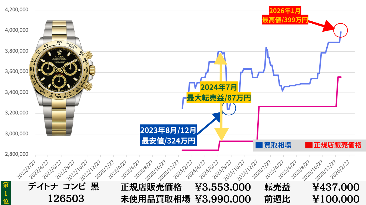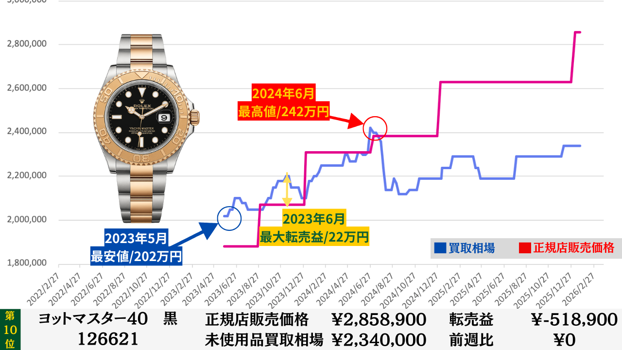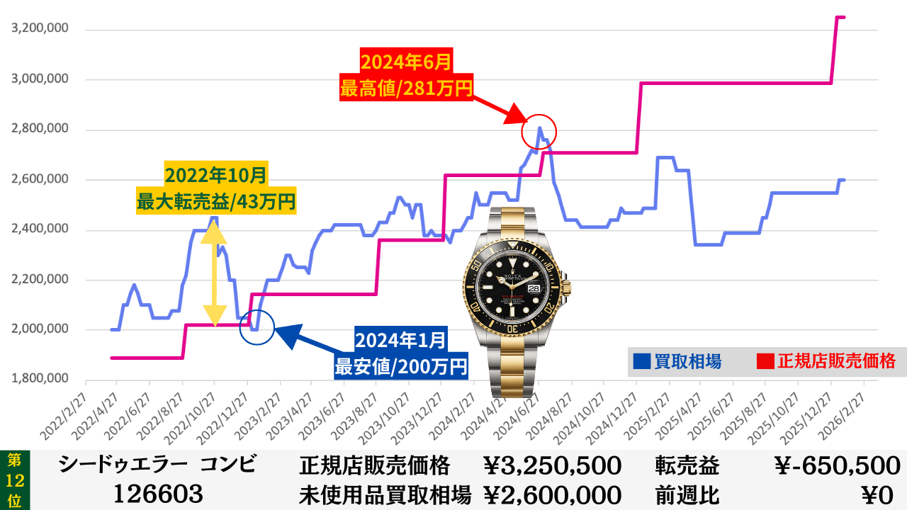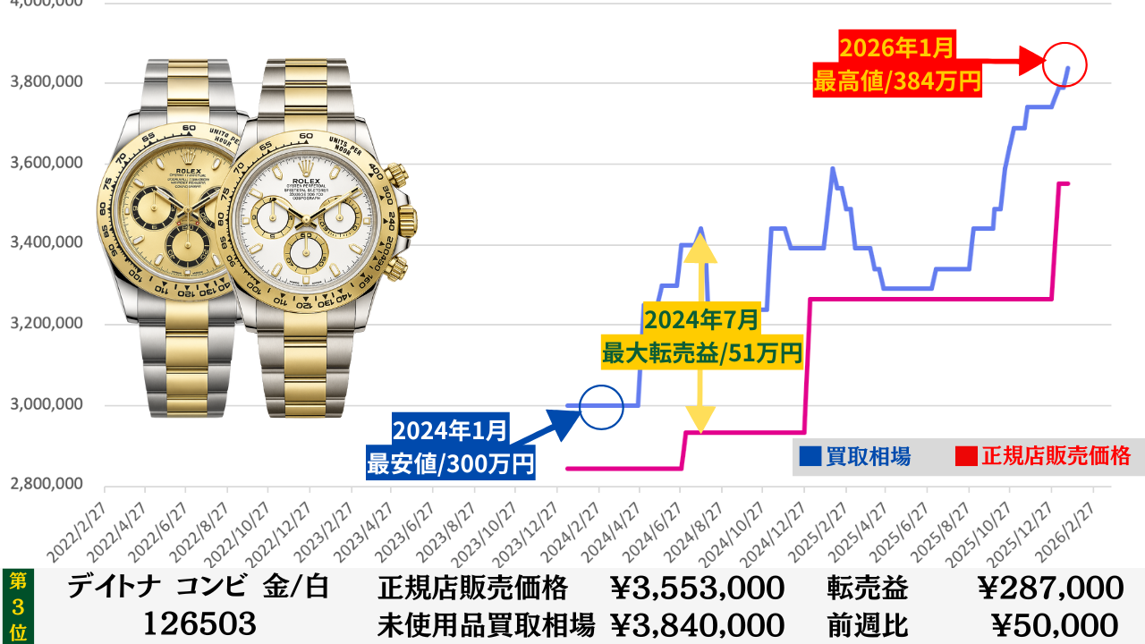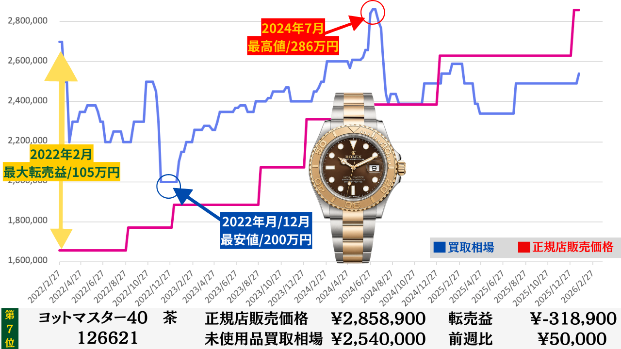 ロレックス買取相場推移グラフ/プロフェッショナルコンビモデル【転売益順】