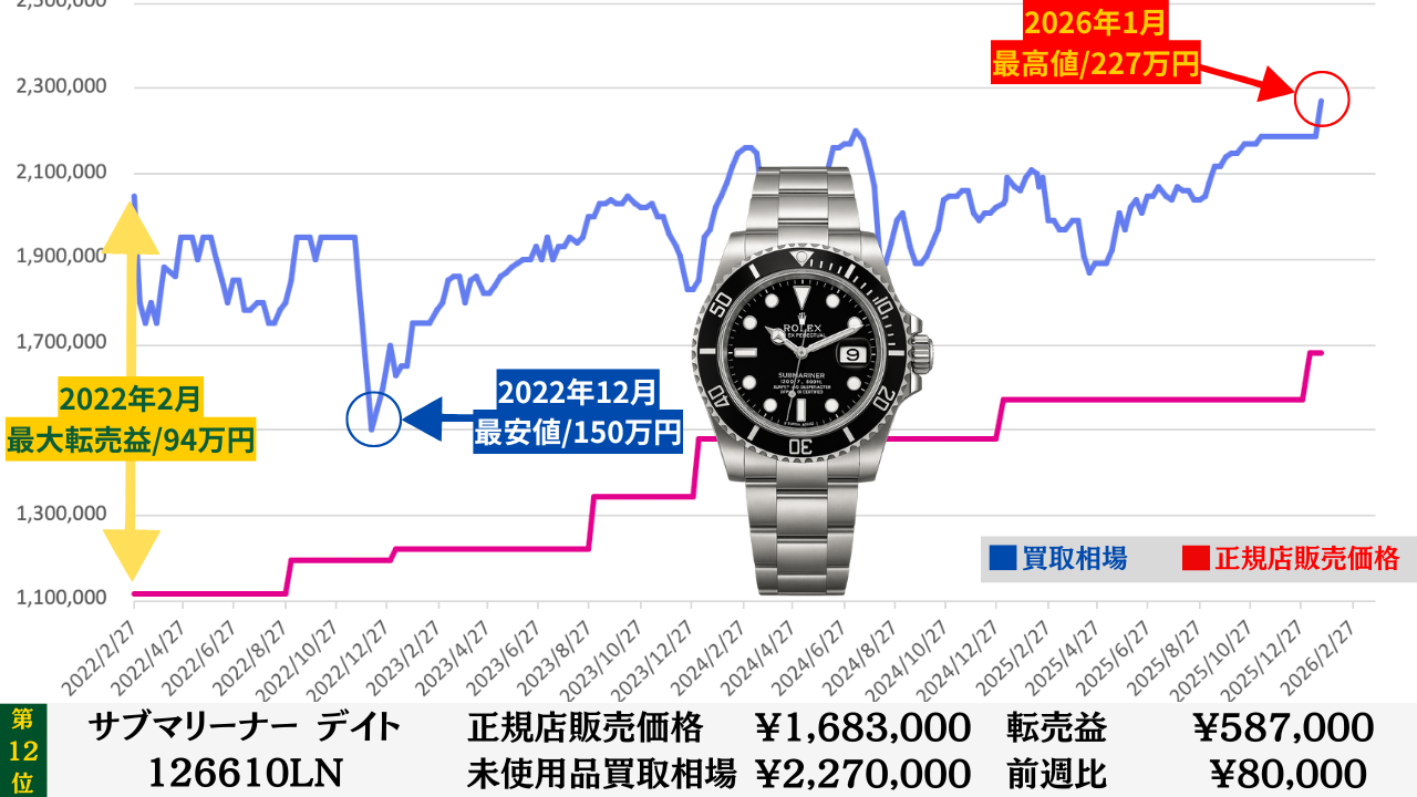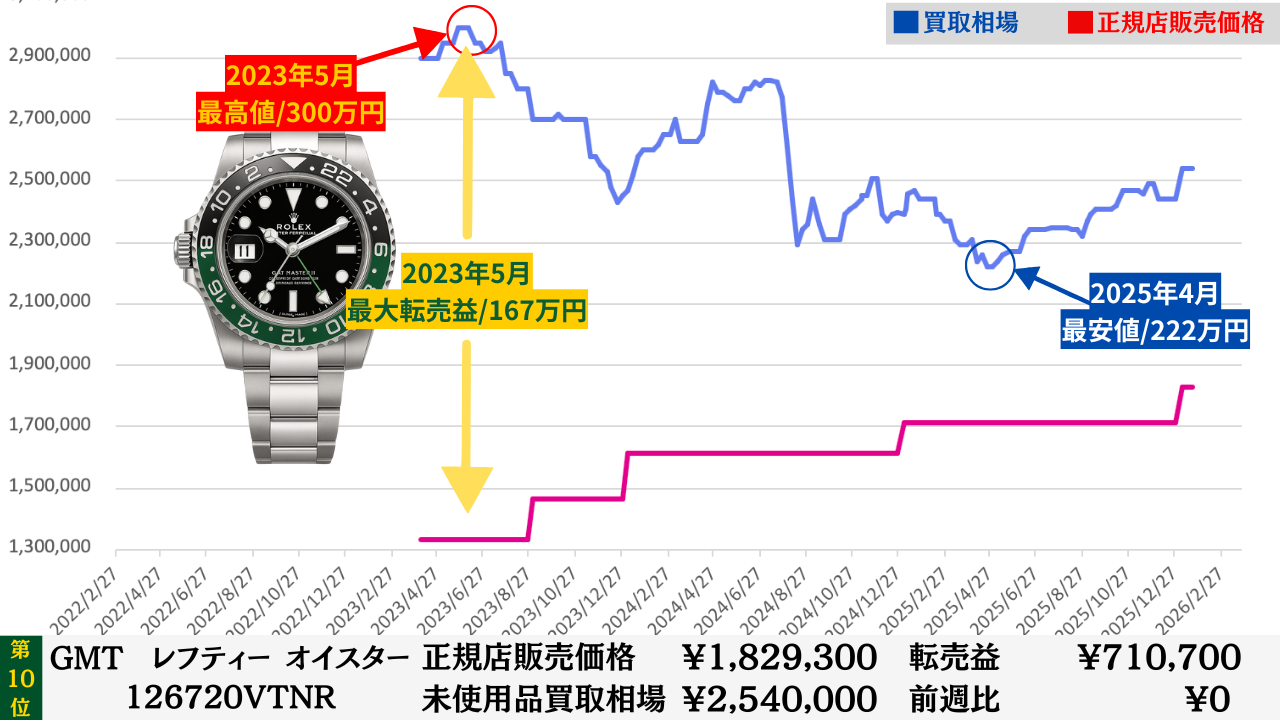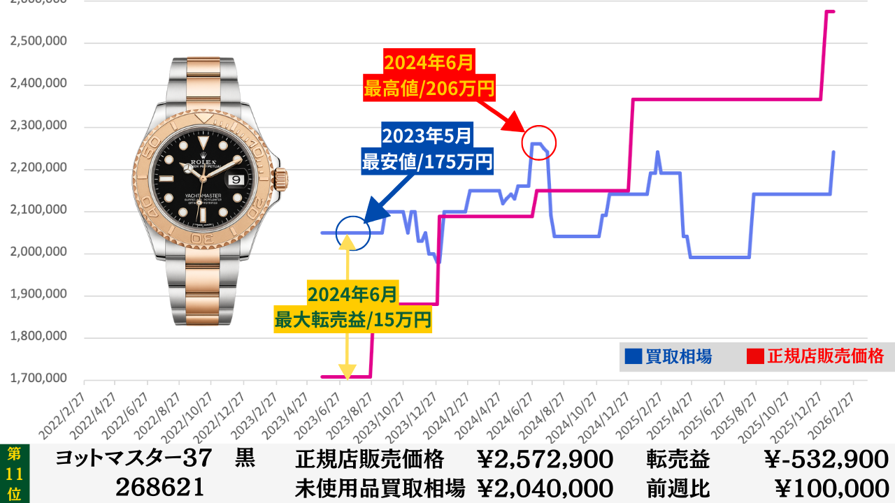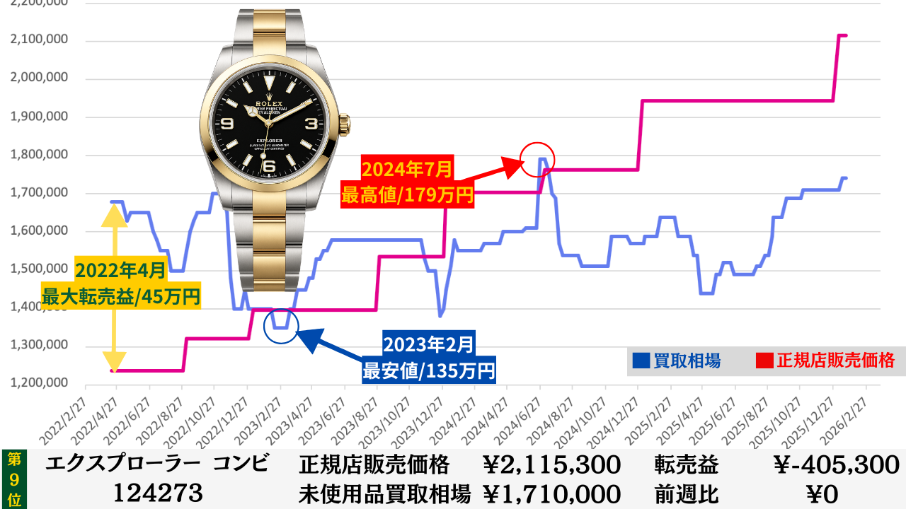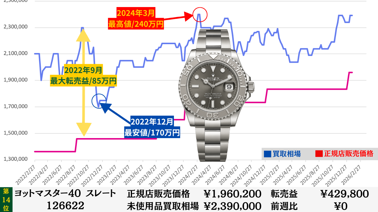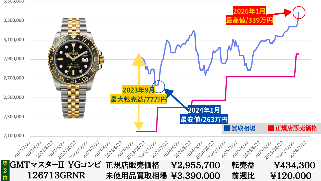 ロレックス買取相場推移グラフ/プロフェッショナルコンビモデル【転売益順】