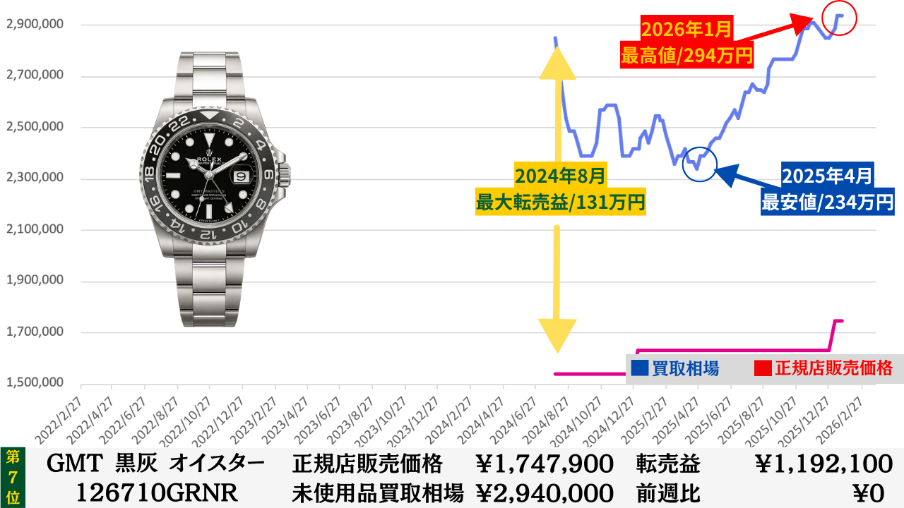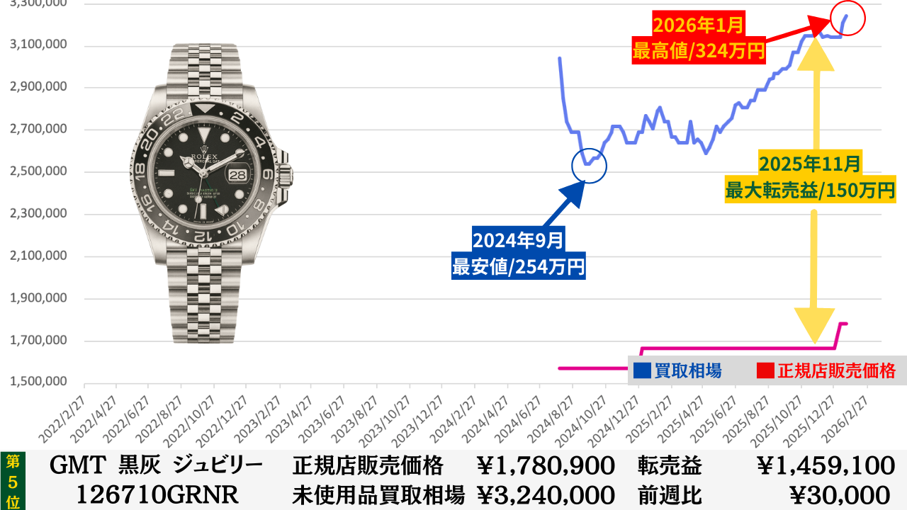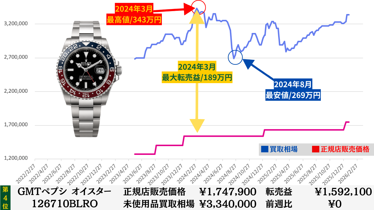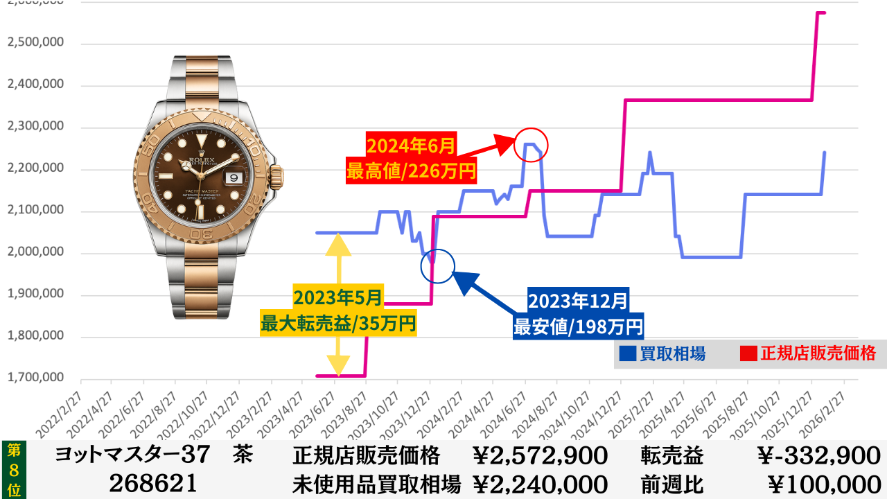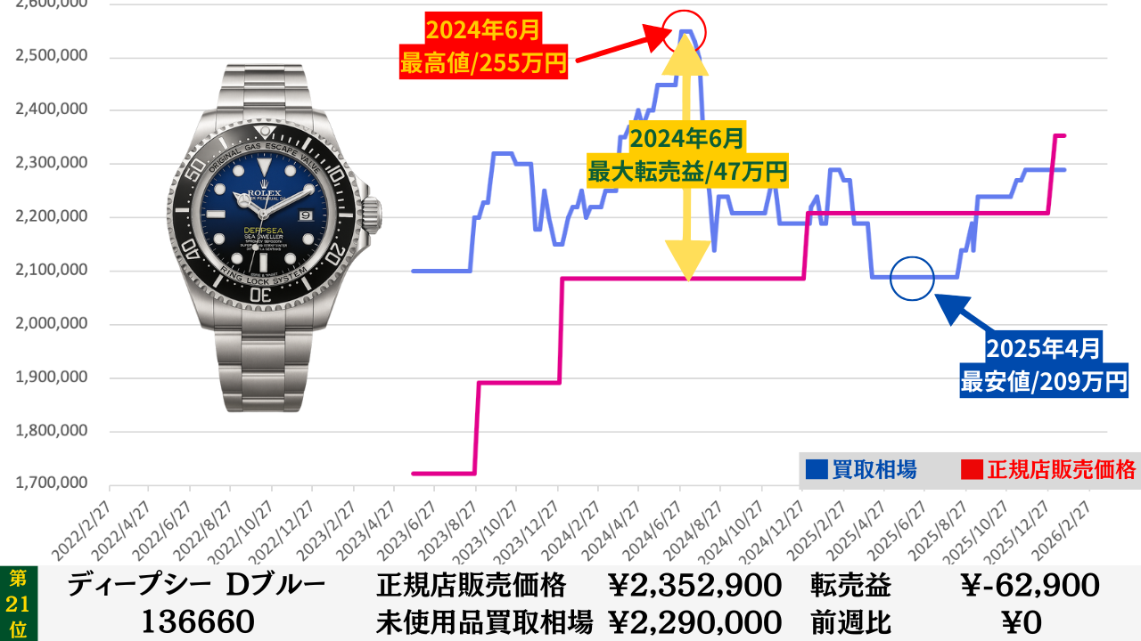 ロレックス買取相場推移グラフ/プロフェッショナルコンビモデル【転売益順】