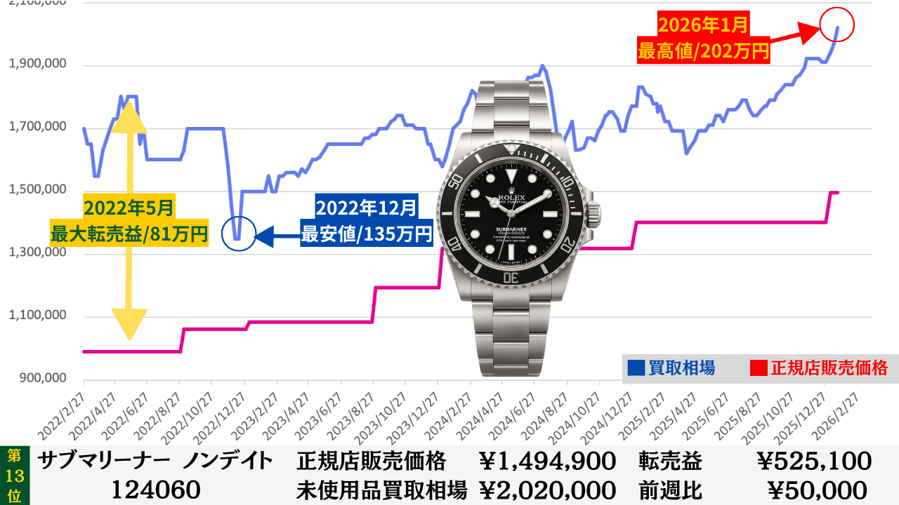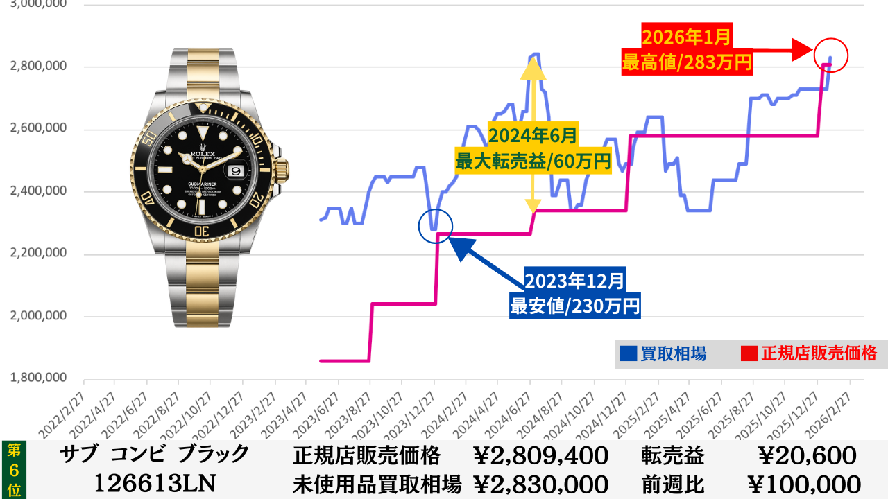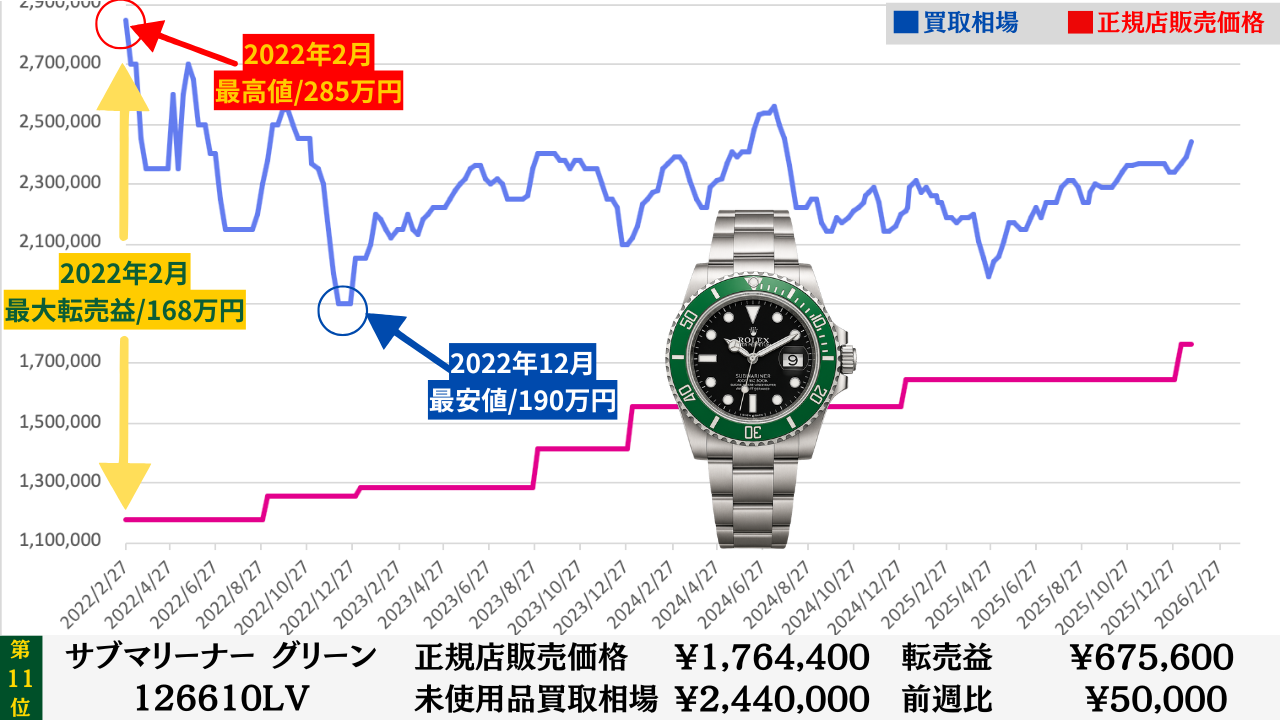 「腕時計を高く売る最大のコツ」は“どこの買取店で売るか”より“どのタイミングで売るか”です。買取店ごとの差は交渉次第で数万円程度に収まることが多いですが、売るタイミングによる相場差は下記買取相場推移グラフでもわかるように、ステンレスモデルであっても数十万円変わります。その為高額売却の最大のコツは買取店の選定より売るタイミングを見極めることです。このページではそのヒントになる買取相場情報を毎週更新していますので、皆さんの売却判断のヒントや相場チェックの参考としてご活用ください。