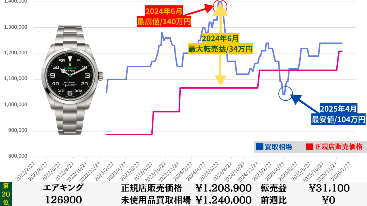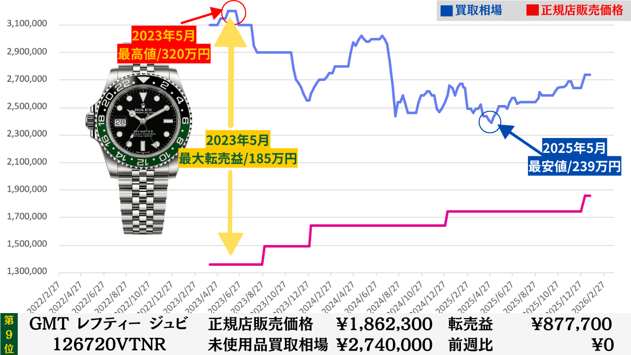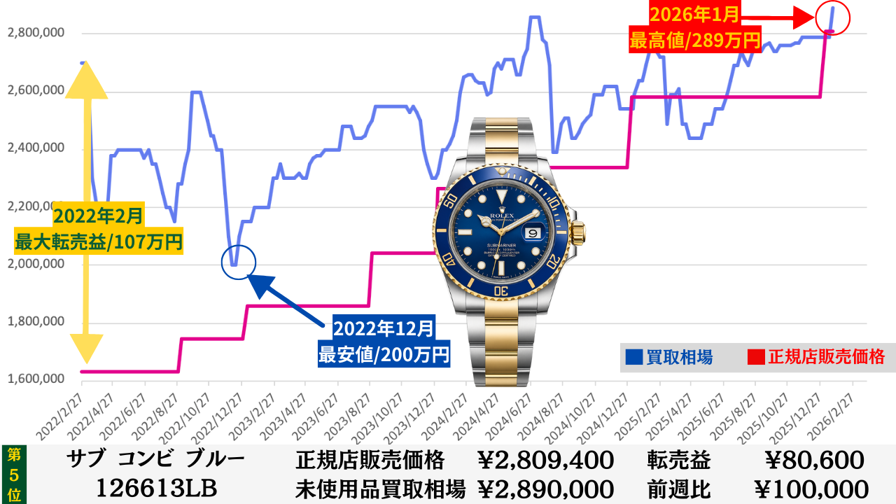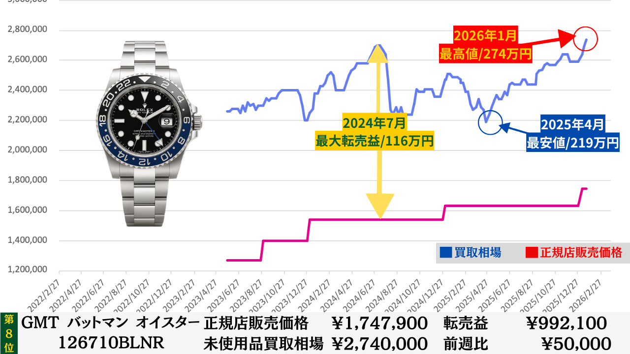 「腕時計を高く売る最大のコツ」は“どこの買取店で売るか”より“どのタイミングで売るか”です。買取店ごとの差は交渉次第で数万円程度に収まることが多いですが、売るタイミングによる相場差は下記買取相場推移グラフでもわかるように、ステンレスモデルであっても数十万円変わります。その為高額売却の最大のコツは買取店の選定より売るタイミングを見極めることです。このページではそのヒントになる買取相場情報を毎週更新していますので、皆さんの売却判断のヒントや相場チェックの参考としてご活用ください。