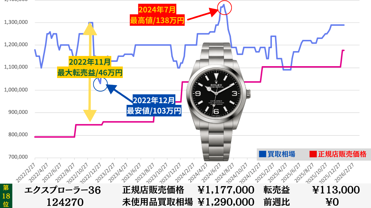 ロレックス買取相場推移グラフ/プロフェッショナルステンレスモデル【転売益順】